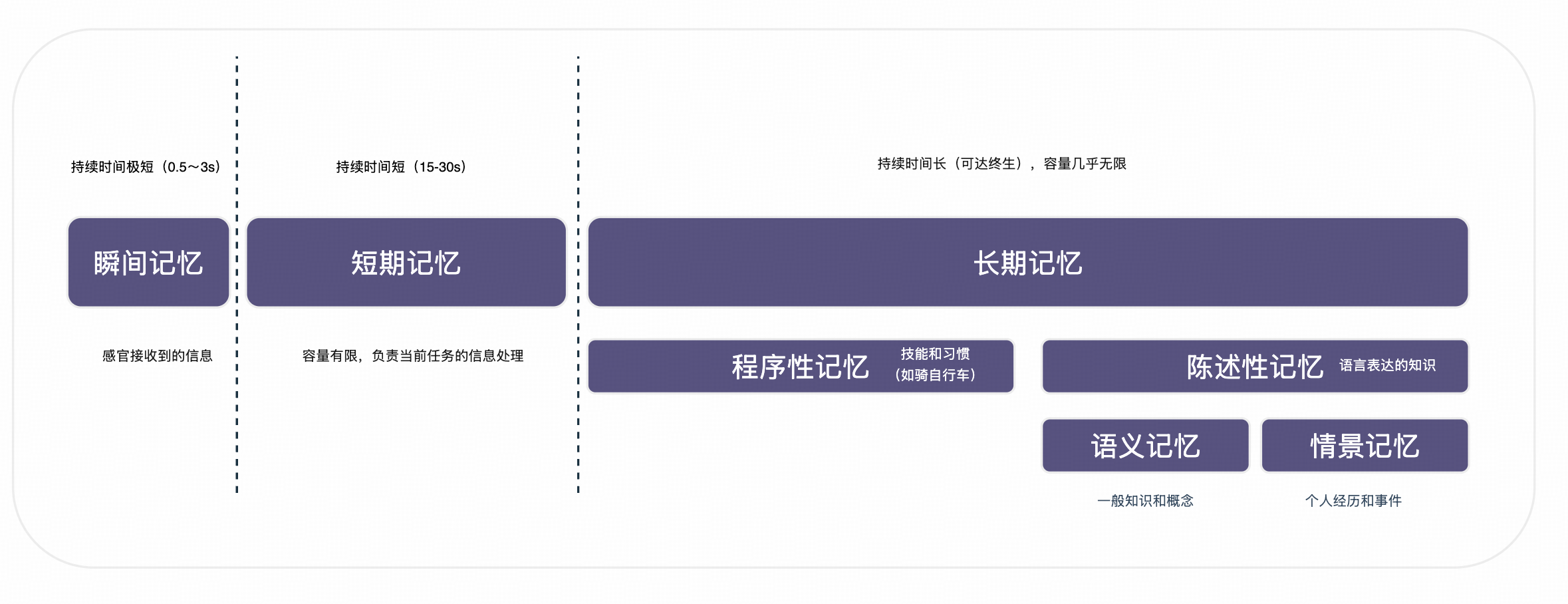 - 长期记忆(Long-term Memory):持续时间长(可达终生),容量几乎无限,进一步分为: